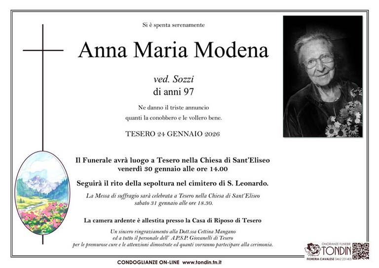 E' mancata Anna Maria Modena vedova Sozzi, 97 anni, di Tesero - Fiemme e Fassa - utilità, eventi, cinema, notizie